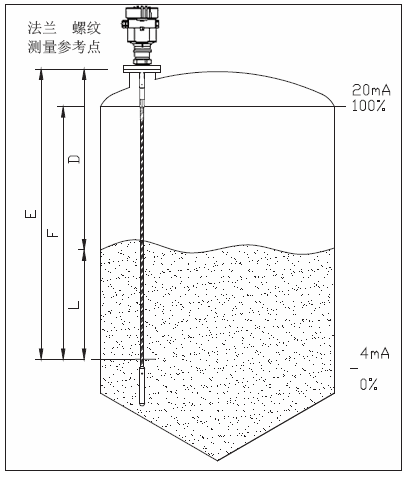 7、如果容器底部是錐型的,傳感器可以安裝導波雷達物位計罐頂中央,這樣可以一直測量到罐底。